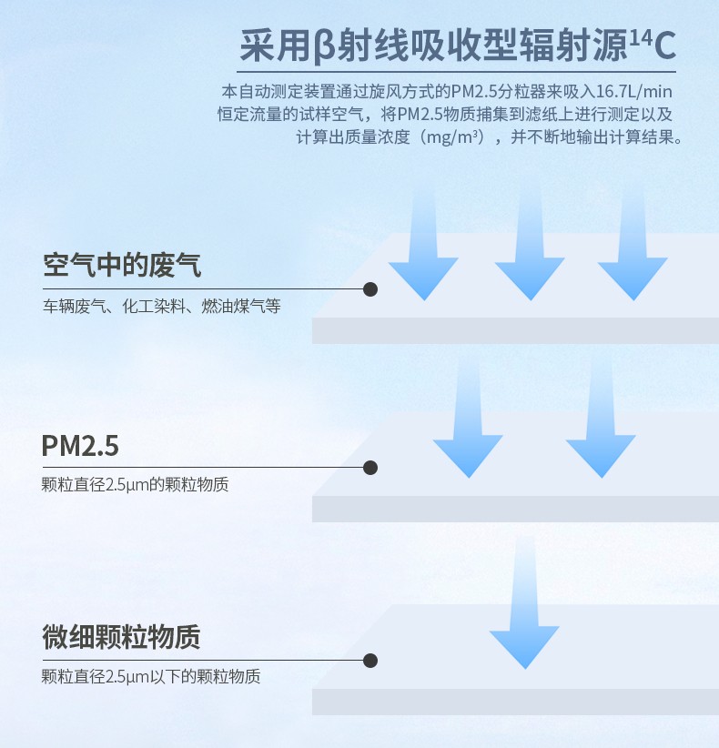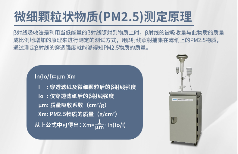 β射線吸收法是利用當?shù)湍芰康摩律渚€照射到物質(zhì)上時,β射線的被吸收量與此物質(zhì)的質(zhì)量成比例地增加的原理來進行測定的測試方式,用β射線照射捕集在濾紙上的PM2.5物質(zhì),通過測定β射線的穿透強度就能夠得知PM2.5物質(zhì)的質(zhì)量。