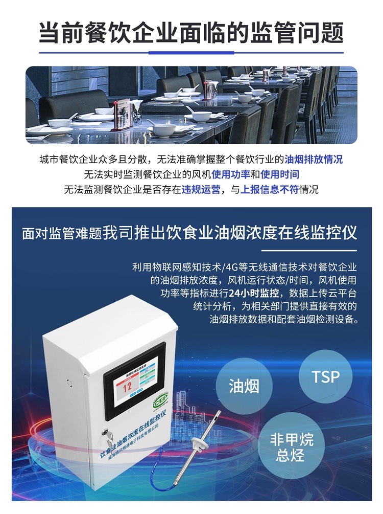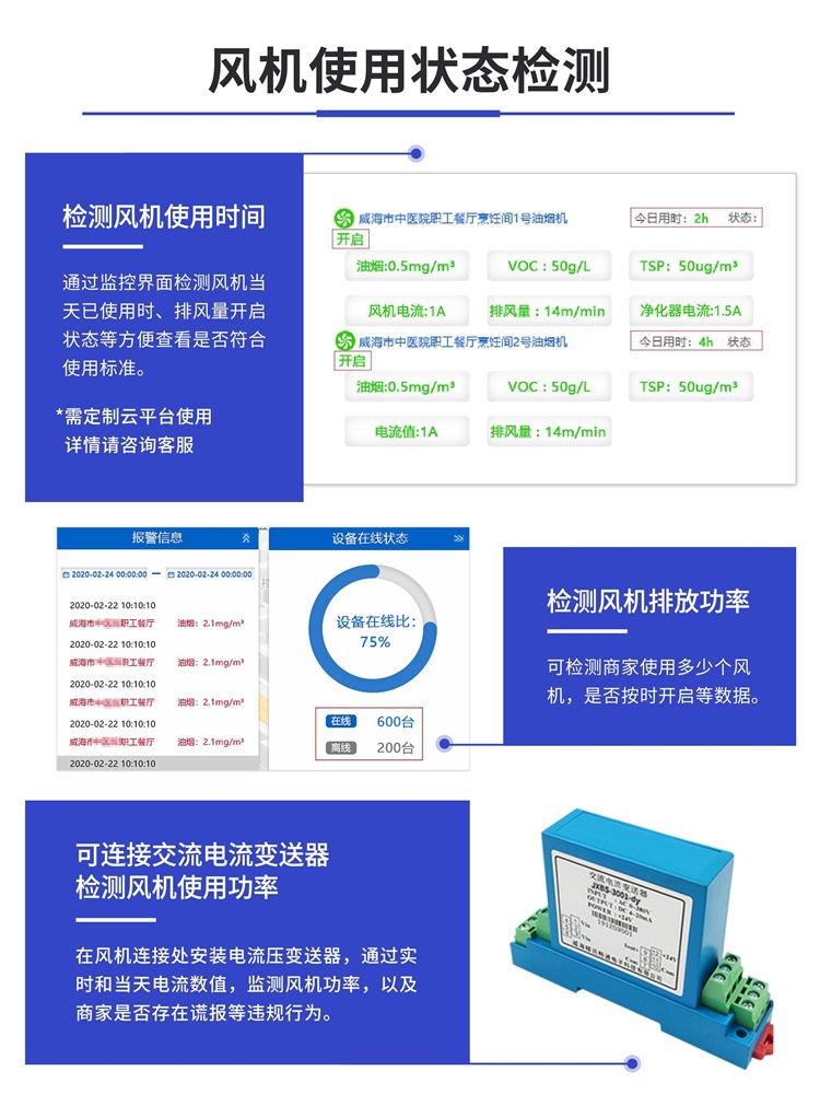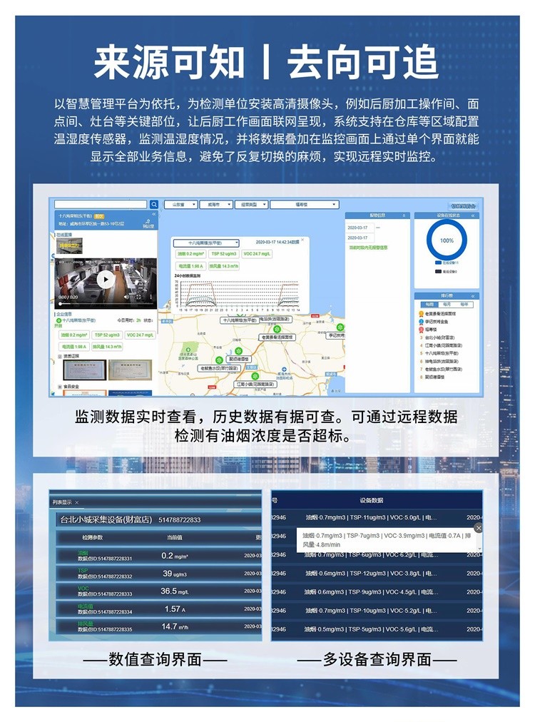 2、可同時監管多個餐廳:在各申報點設置的油煙監測設備,通過先進的科學技術,結合人性化的設計理念,構建了一整套高效、系統的食品衛生安全遠程監管可視化服務體系,節省了監管部門的工作時間,減輕了工作壓力,提高了工作效率。