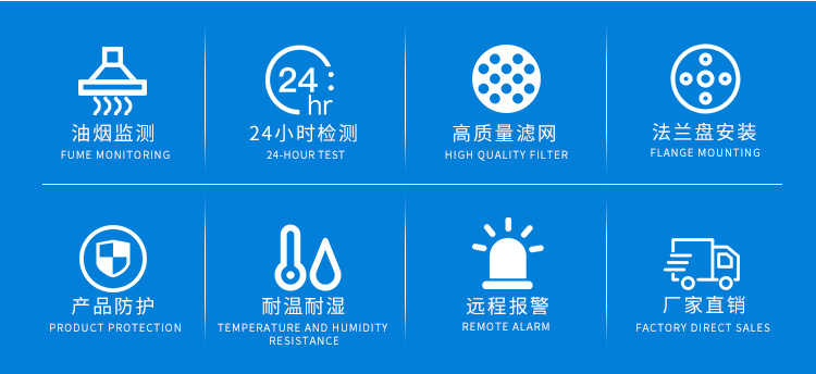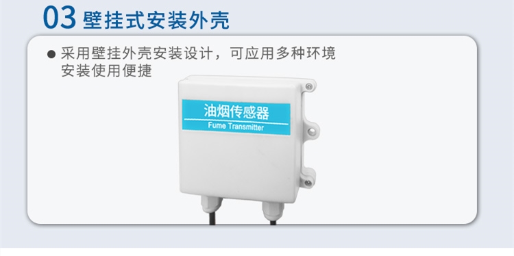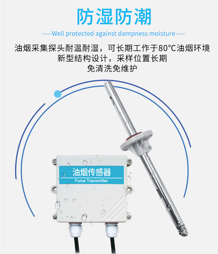 4、防濕防潮:油煙傳感器采集探頭耐溫耐濕,可長期工作于80℃油煙環(huán)境,新型結(jié)構(gòu)設計,采樣位置長期免清洗免維護;