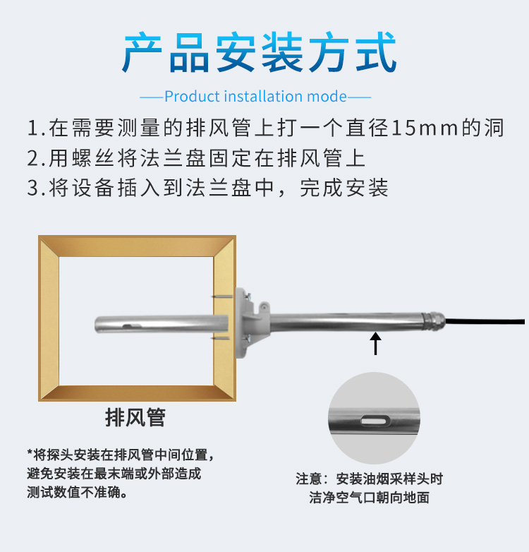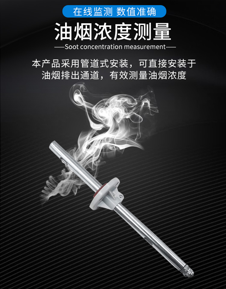 1、油煙濃度測量:在線監(jiān)測數(shù)值準確,油煙傳感器采用管道式安裝,可直接安裝于油煙排出通道,有效測量油煙濃度;