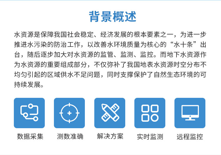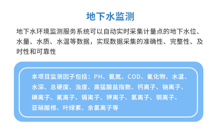近年來由于地下水長期影響造成的地質災害情況頻頻發生,地面沉降、地裂縫、巖溶塌陷、海水入侵、水質污染問題越來越嚴重,引起國家以及相關部門關注,針對這個情況,精訊暢通自主研發了地下水環境監測系統。可以快速監測ph、氨氮、cod、氰化物、濁度以及各種離子。