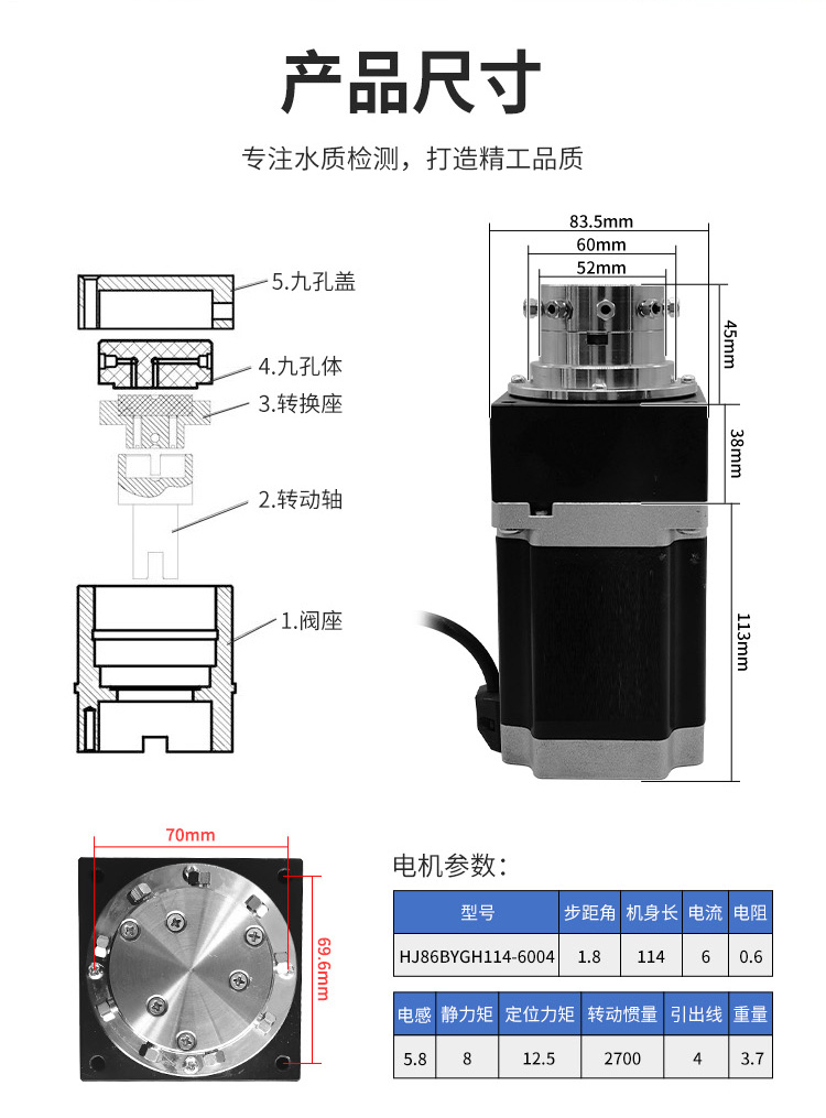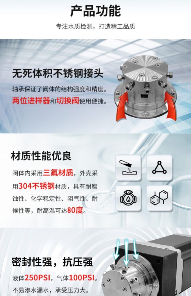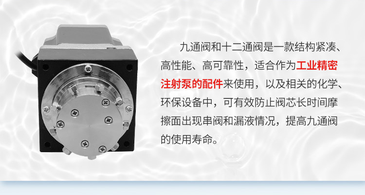 水質(zhì)九通閥十二通閥是一款結(jié)構(gòu)緊湊、高性能、高可靠性的閥門,是水質(zhì)在線監(jiān)測設(shè)備的配件,適合作為工業(yè)精密注射泵的配件來使用,以及相關(guān)的化學(xué)、環(huán)保設(shè)備中,可有效防止閥芯長時間摩擦面出現(xiàn)串閥和漏液情況,提高水質(zhì)九通閥的使用壽命。閥體內(nèi)采用三氟材質(zhì),外殼采用304不銹鋼材質(zhì),具有耐腐蝕性、化學(xué)穩(wěn)定性、阻氣性、耐候性等,耐高溫可達80度。