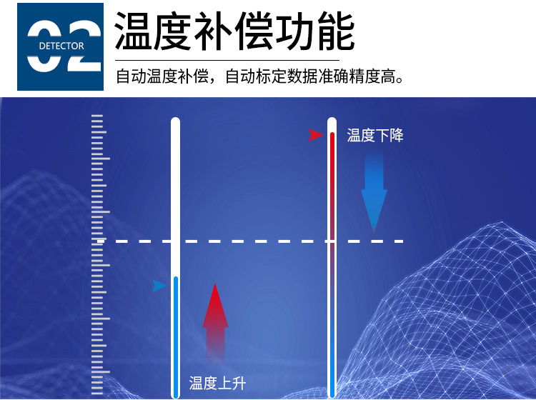 2、溫度補償功能:自動溫度補償,自動標定數(shù)據(jù)準確精度高。