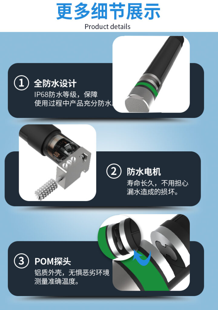 1、全防水設(shè)計:IP68防水等級,保障使用過程中產(chǎn)品充分防水。