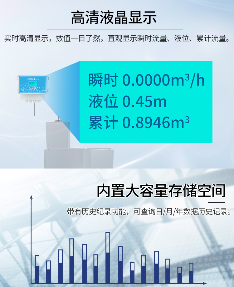 3、明渠流量計內置大容量存儲空間:帶有歷史紀錄功能,可查詢日/月/年數據歷史記錄。