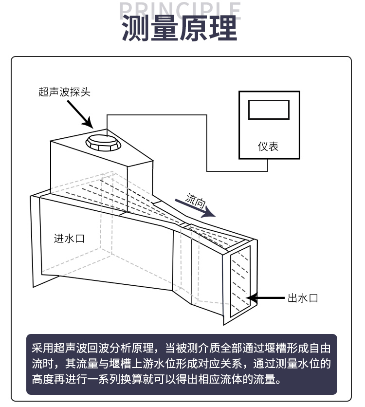 超聲波明渠流量計釆用超聲波回波分析原理,當被測介質全部通過堰槽形成自由流時,其流量與堰槽上游水位形成對應關系,通過測量水位的高度再進行一系列換算就可以得出相應流體的流量。