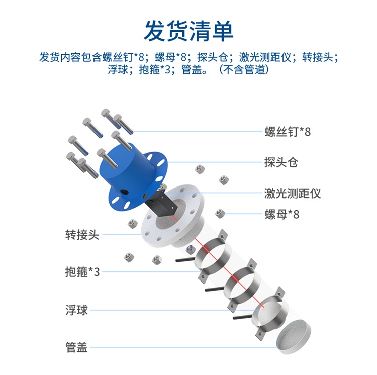 浮球激光水位計使用環形抱箍固定到河岸或大壩的墻壁上,當水進入檢測通道后,管道內的浮漂會受水的影響上浮,位于頂端的激光水位計發射激光,到達檢測通道底部,收到反光浮漂的影響激光會返回,激光水位計檢測到反射光后,通過內部軟件計算得出水位距離。