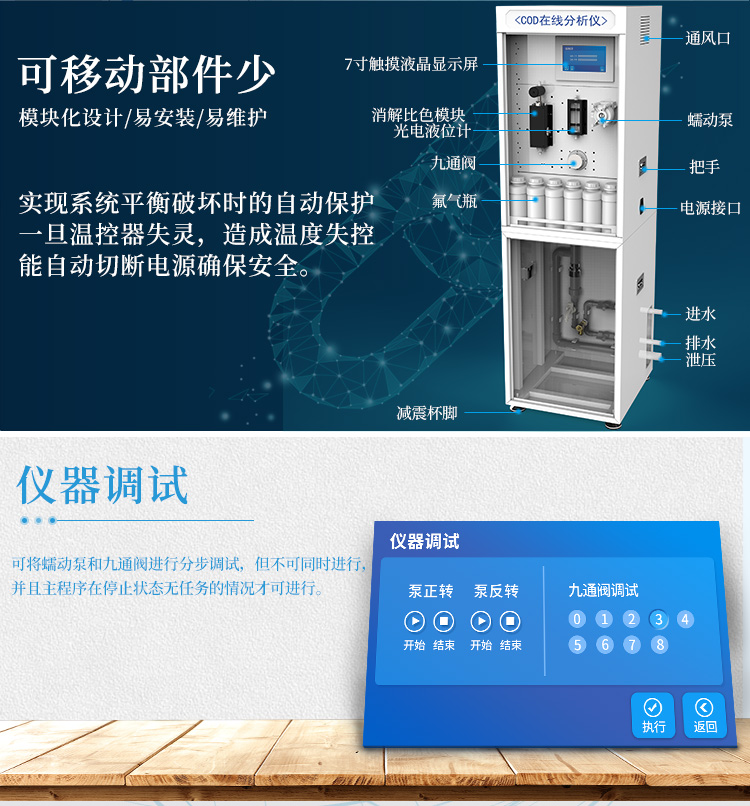 3、自動(dòng)檢測自動(dòng)清洗:國標(biāo)法水質(zhì)在線分析儀可自動(dòng)清洗采樣管道、計(jì)量單位、消解反應(yīng)單位、測量單元的管線。